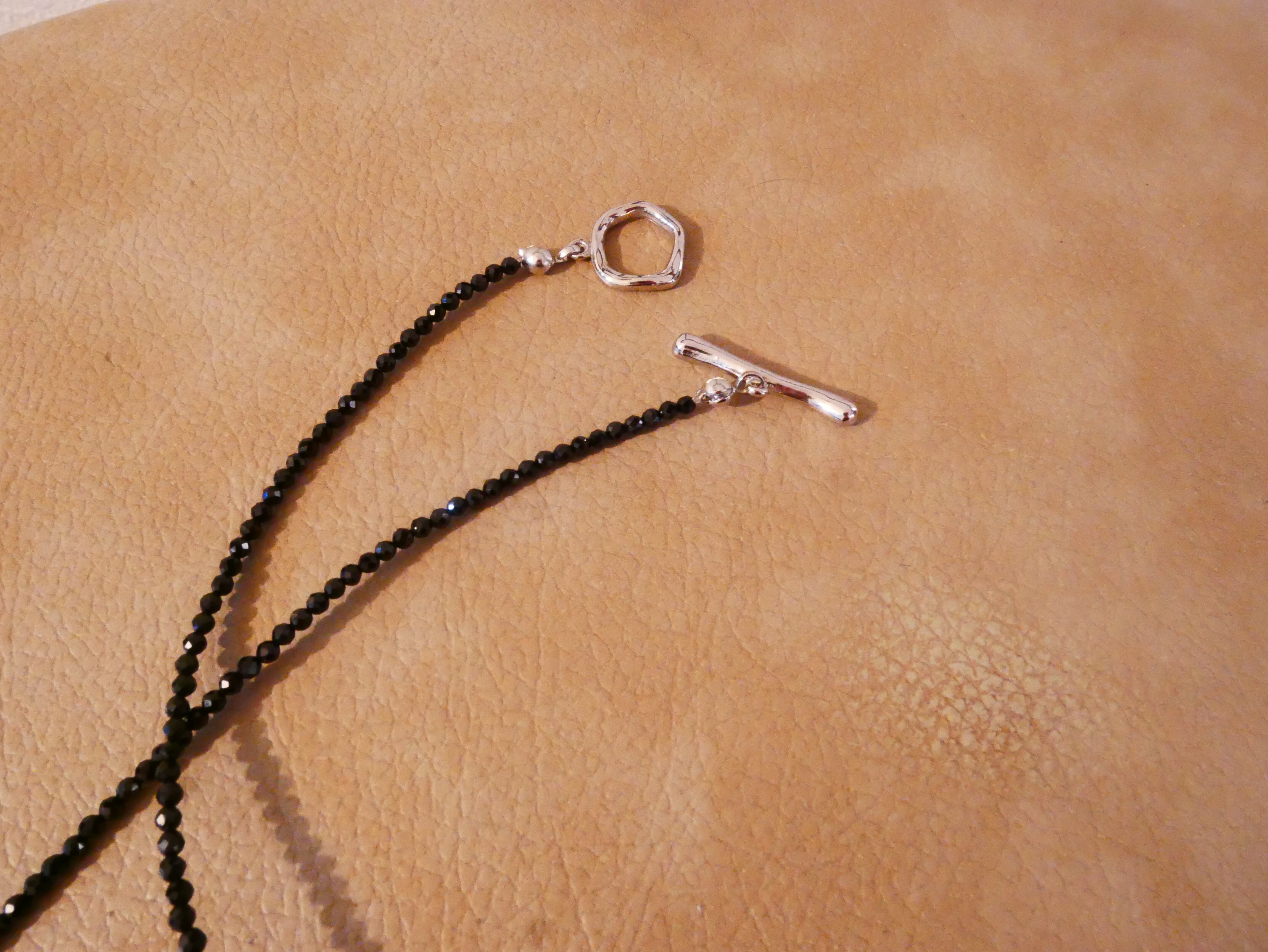 オニキスの深い黒色がシックで洗練された雰囲気を演出し、淡水パールが一層華やかさを引き立てます。小さな粒に施された多面カットが、光を受けて細やかな輝きを放ちます。